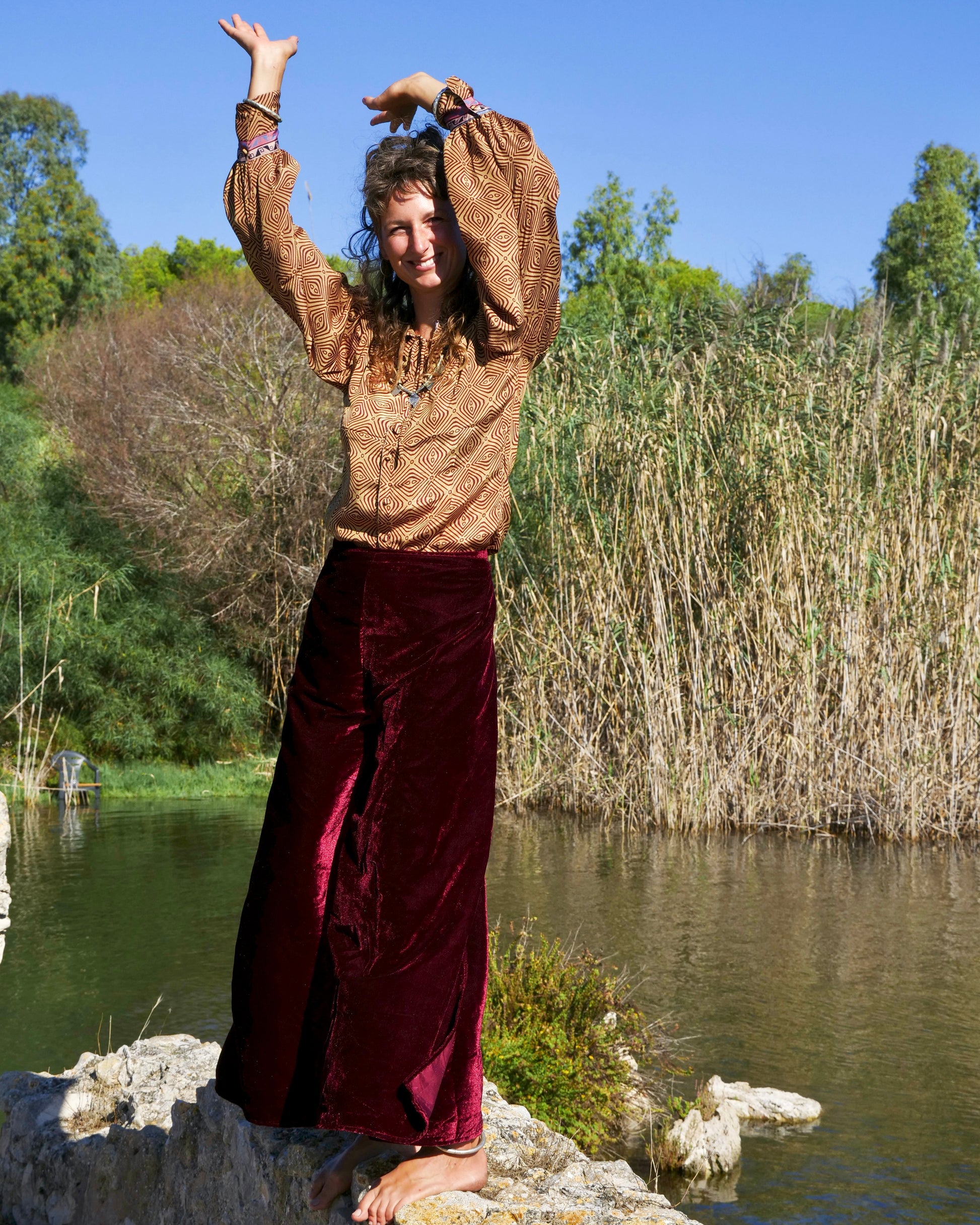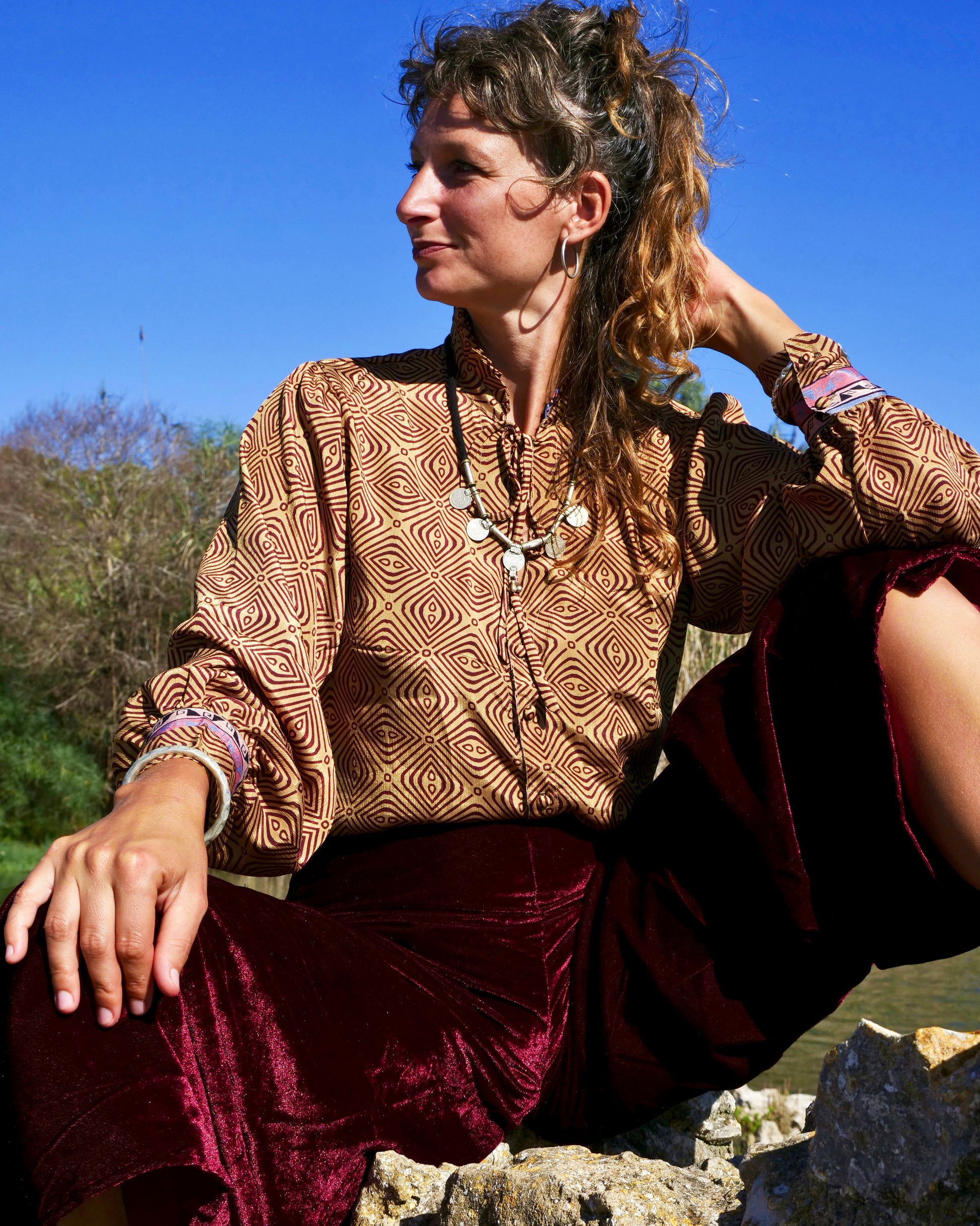 Flora è una camicia raffinata in setà indiana, pensata per esaltare l’eleganza dei gilet. Il suo design richiama il fascino barocco, con dettagli ricercati che evocano la moda di epoche passate. Il colletto a ventaglio e il delicato nastro all’inizio dello scollo aggiungono un tocco di romanticismo, mentre le maniche a palloncino donano volume e carattere, creando un equilibrio perfetto tra classicismo e modernità.
