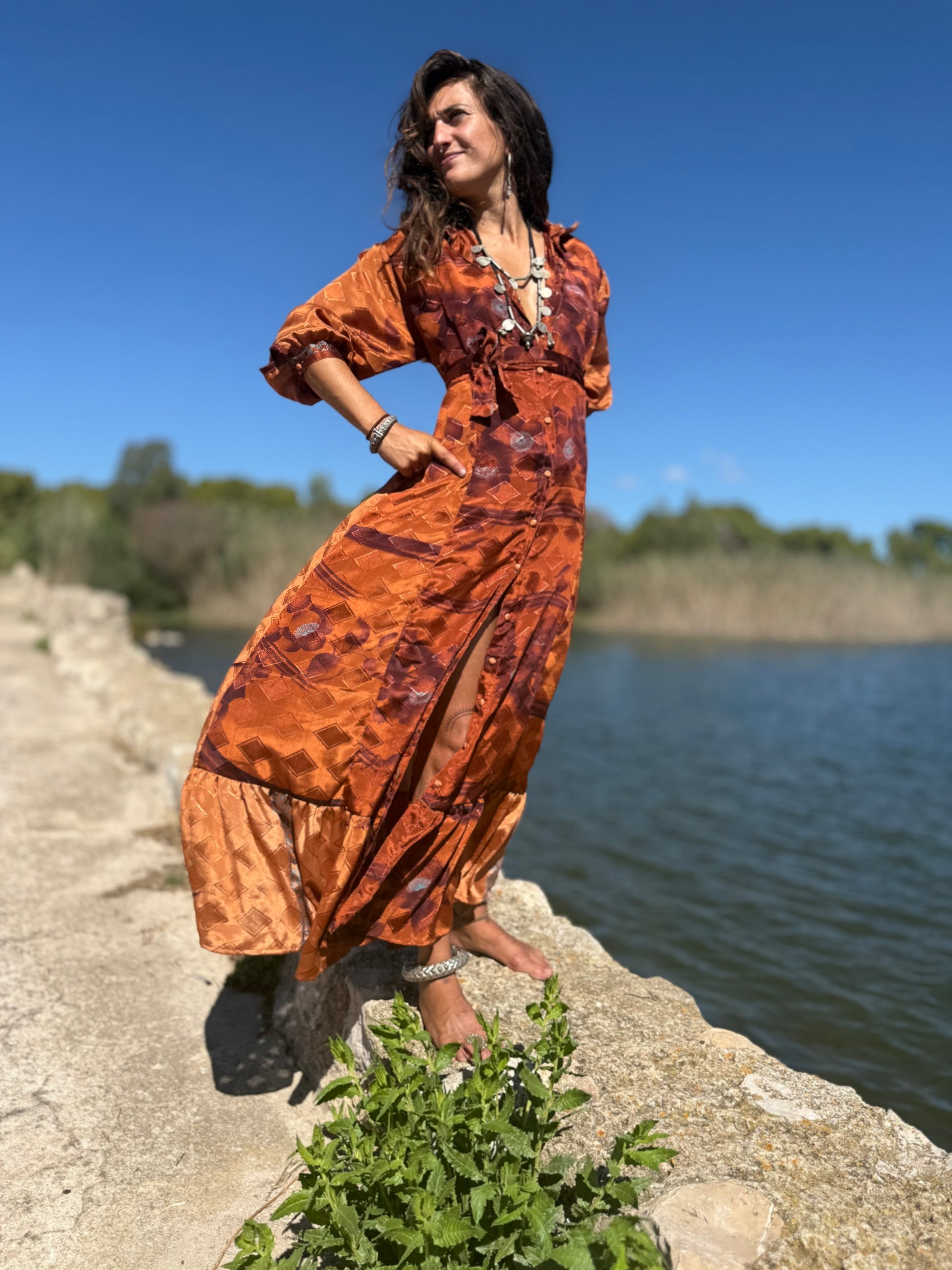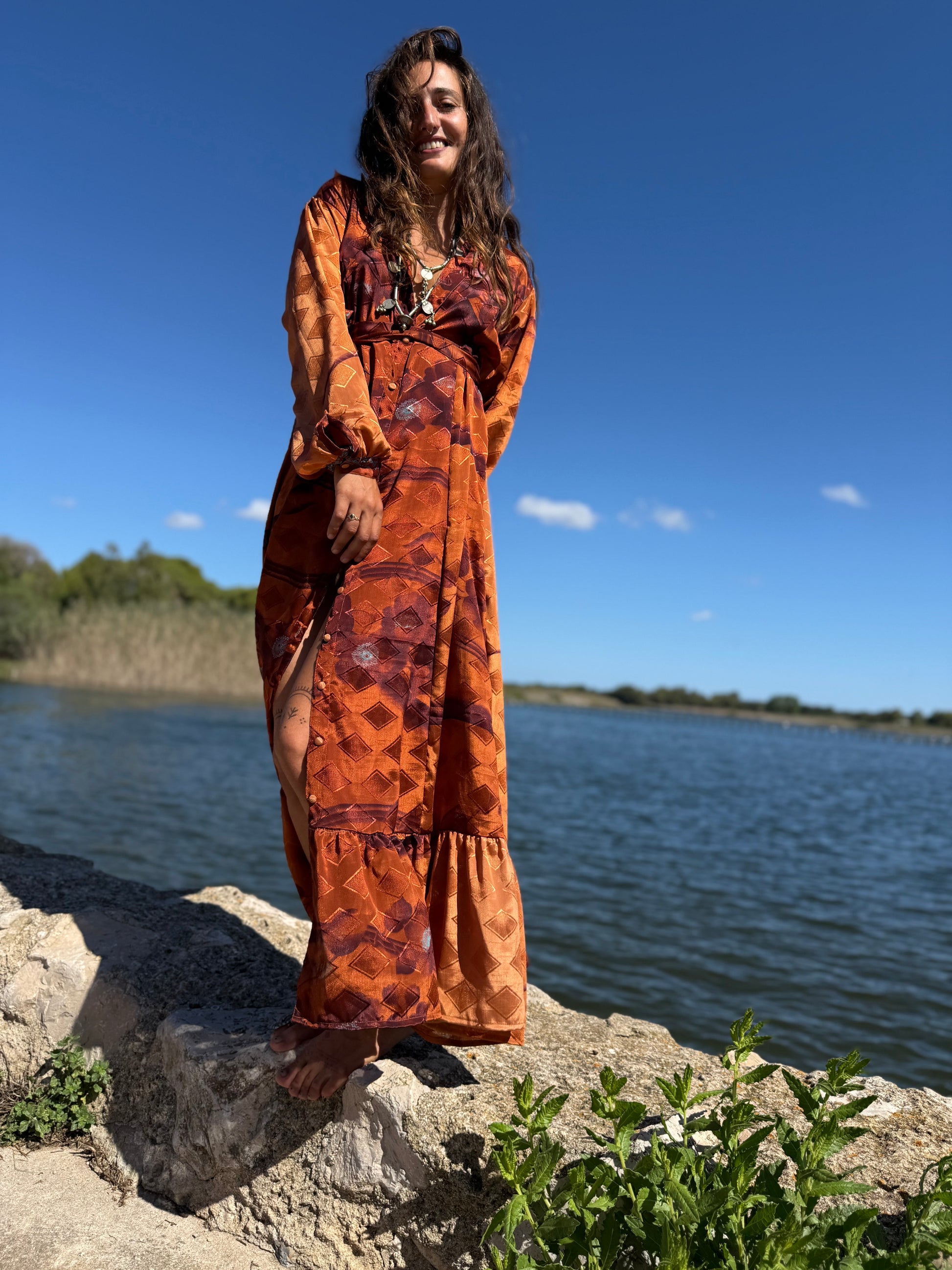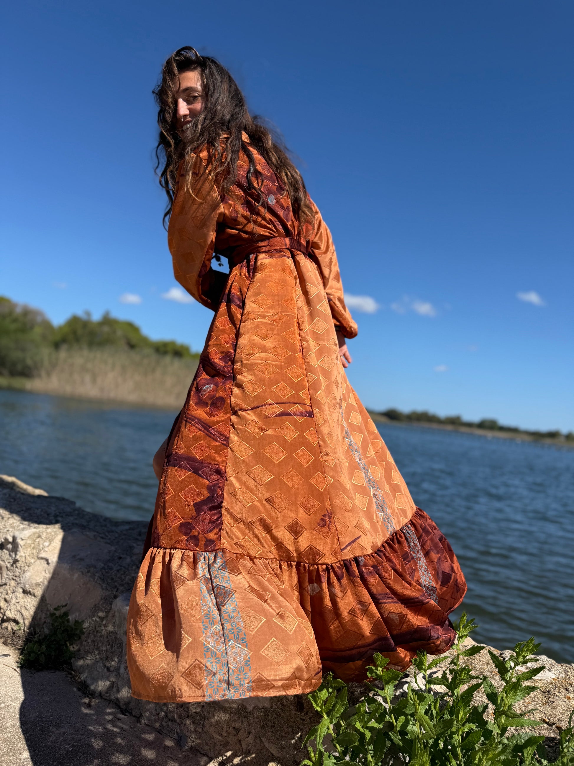 Questo capo é adatto per vestire dalla primavera all’autunno; puoi indossarlo come abito, copri costume e come spolverino. Manica ampia a palloncino.