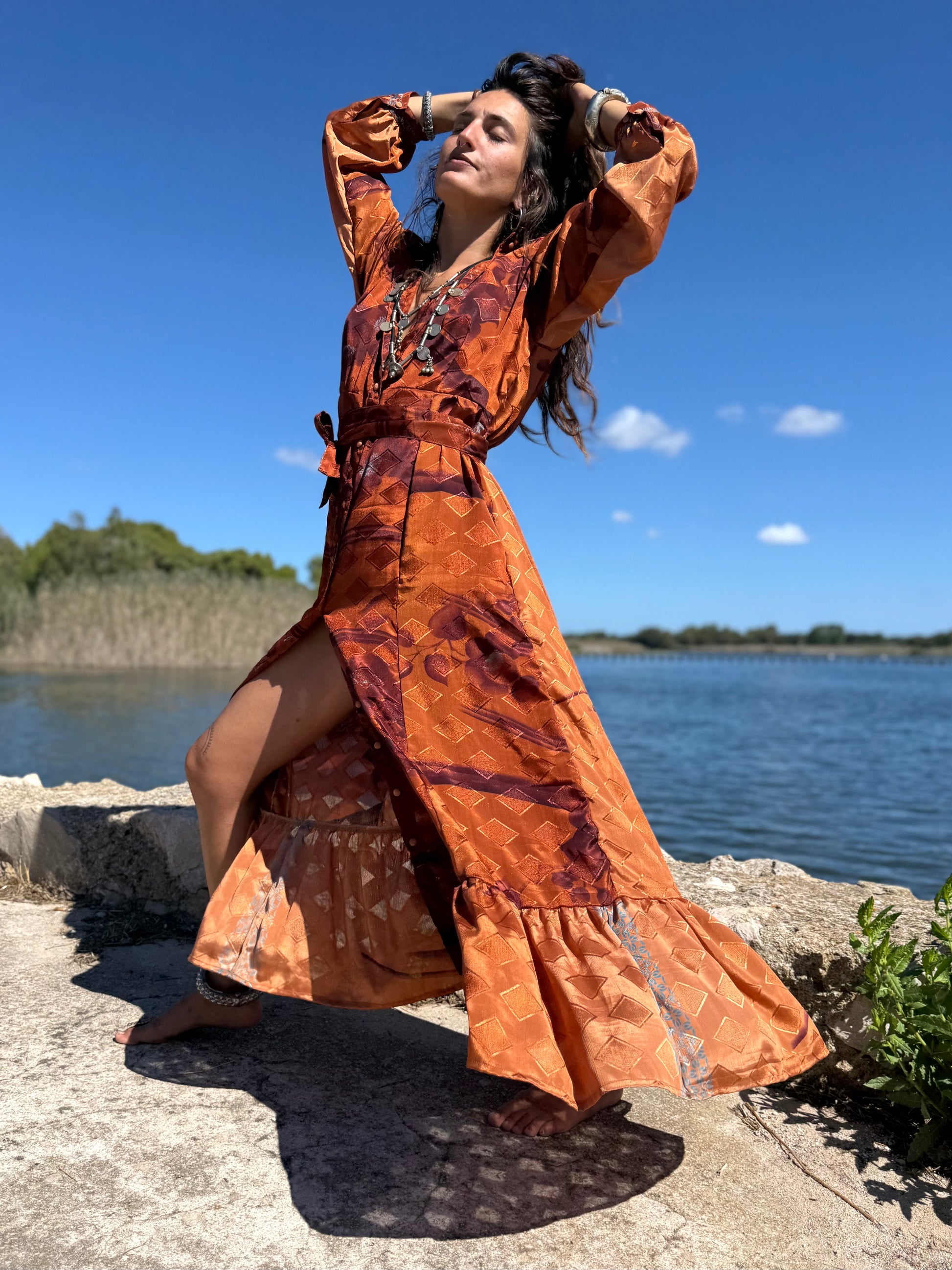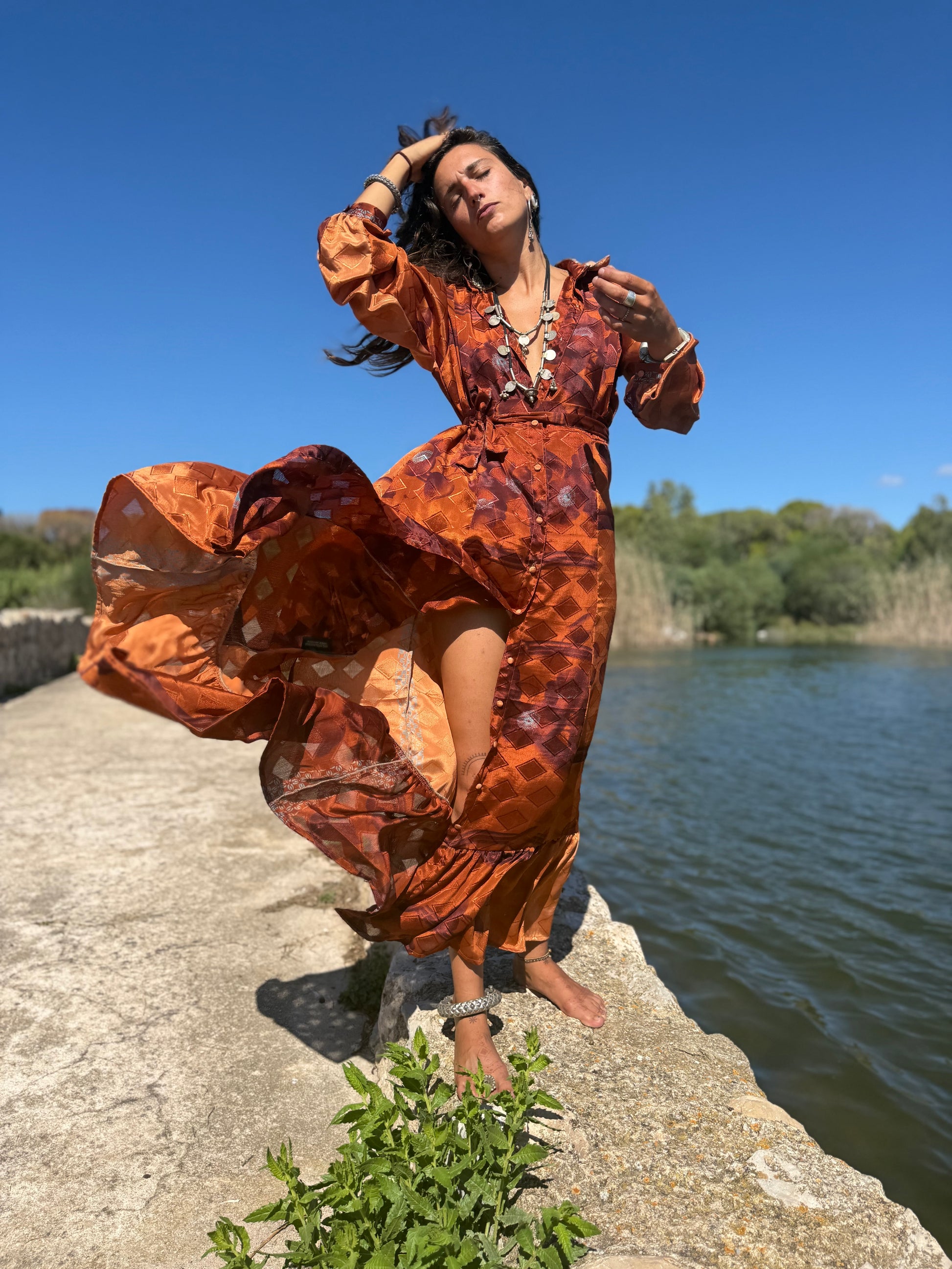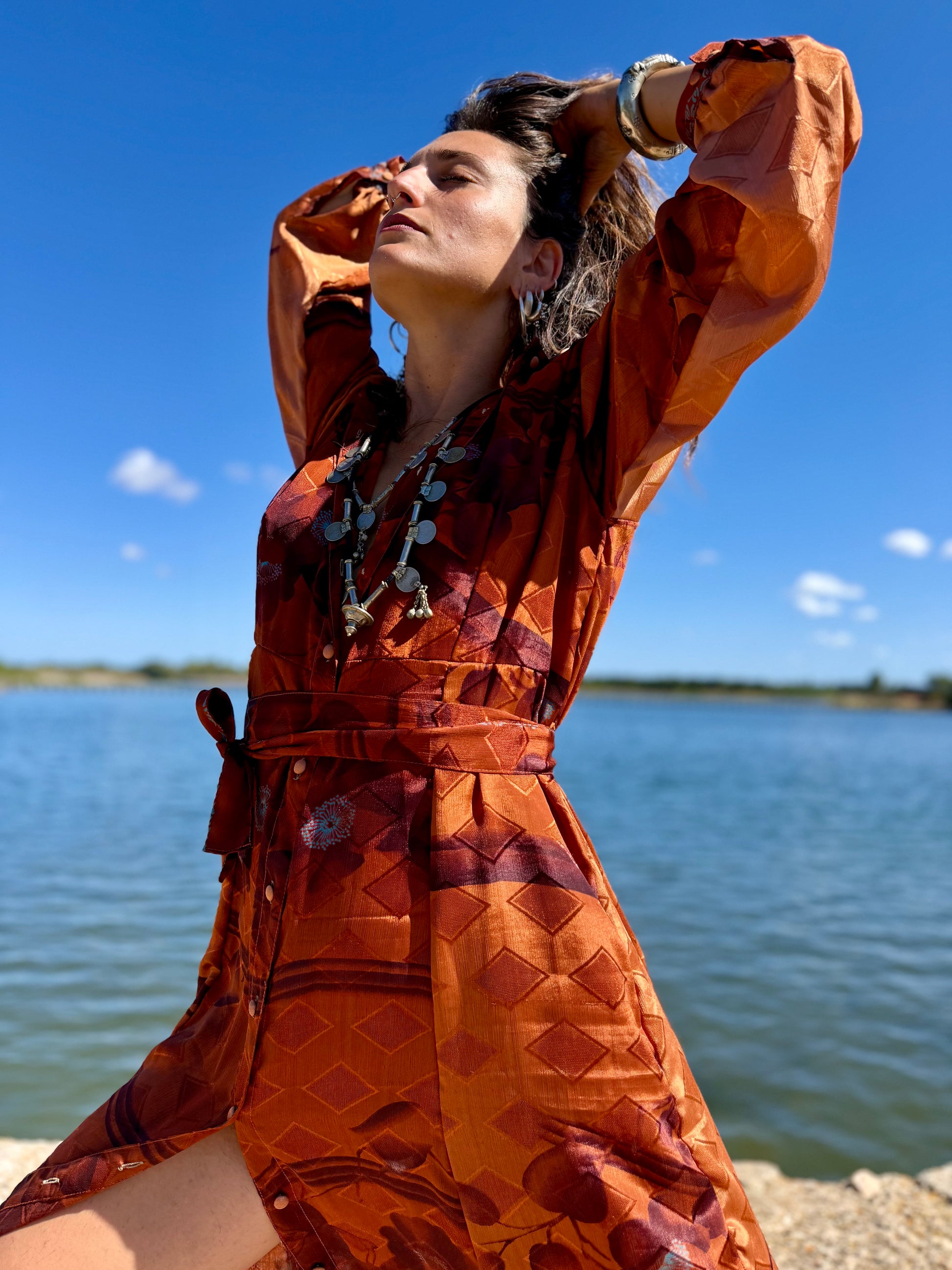 Questo capo é adatto per vestire dalla primavera all’autunno; puoi indossarlo come abito, copri costume e come spolverino. Manica ampia a palloncino.