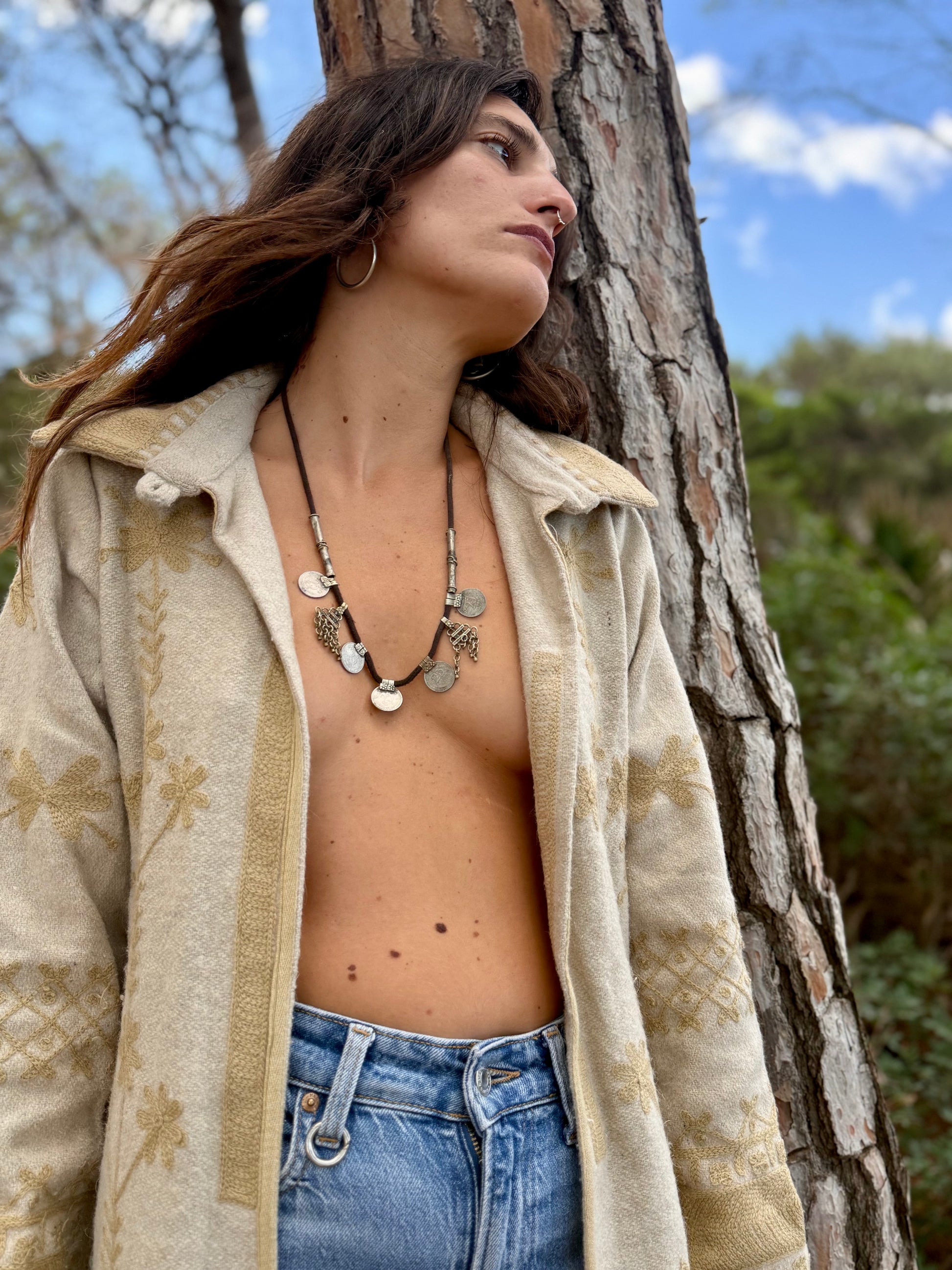 La collana Jalaja è un gioiello di ispirazione dalle terre del Rajasthan, realizzato a mano con monete antiche che hanno viaggiato di mano in mano attraverso le generazioni, custodendo storie di vita nel tempo.