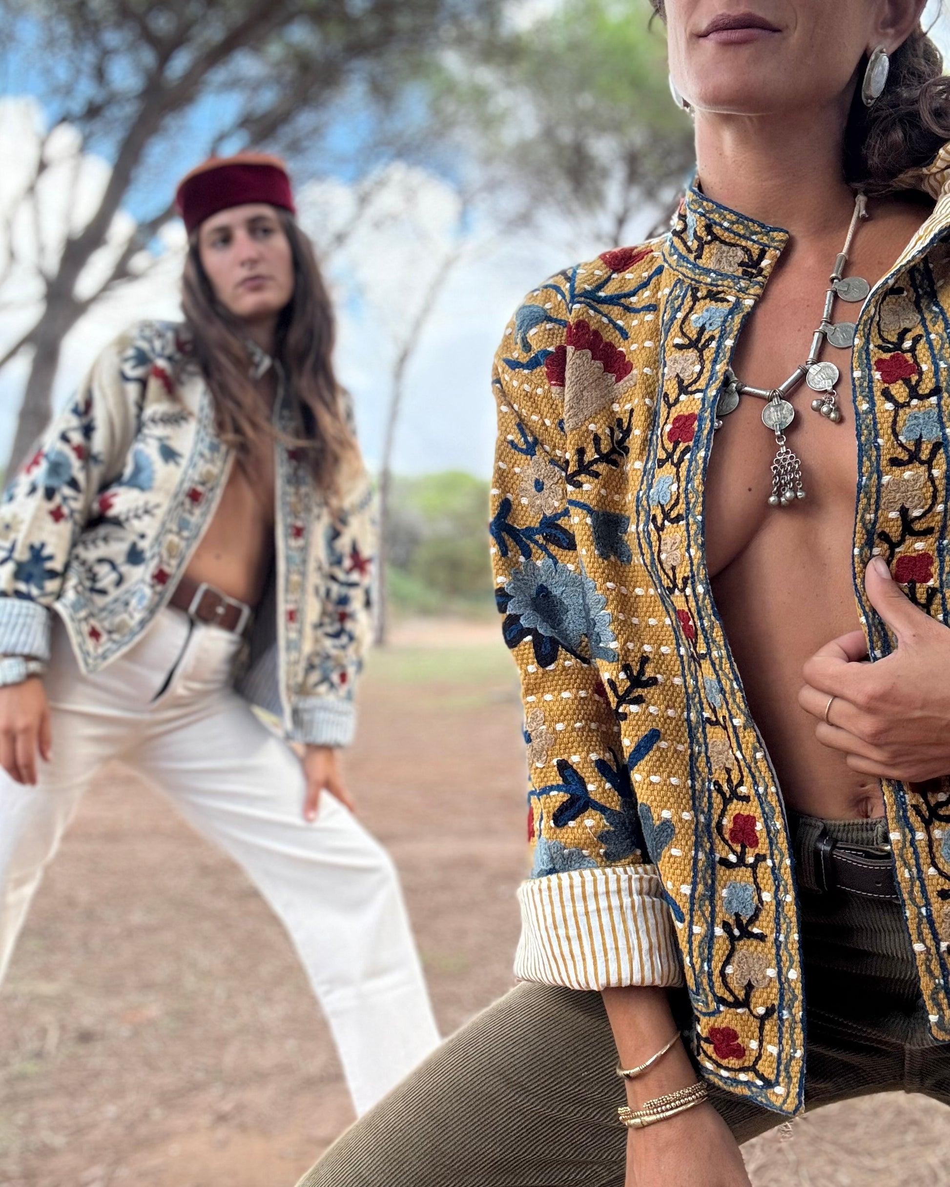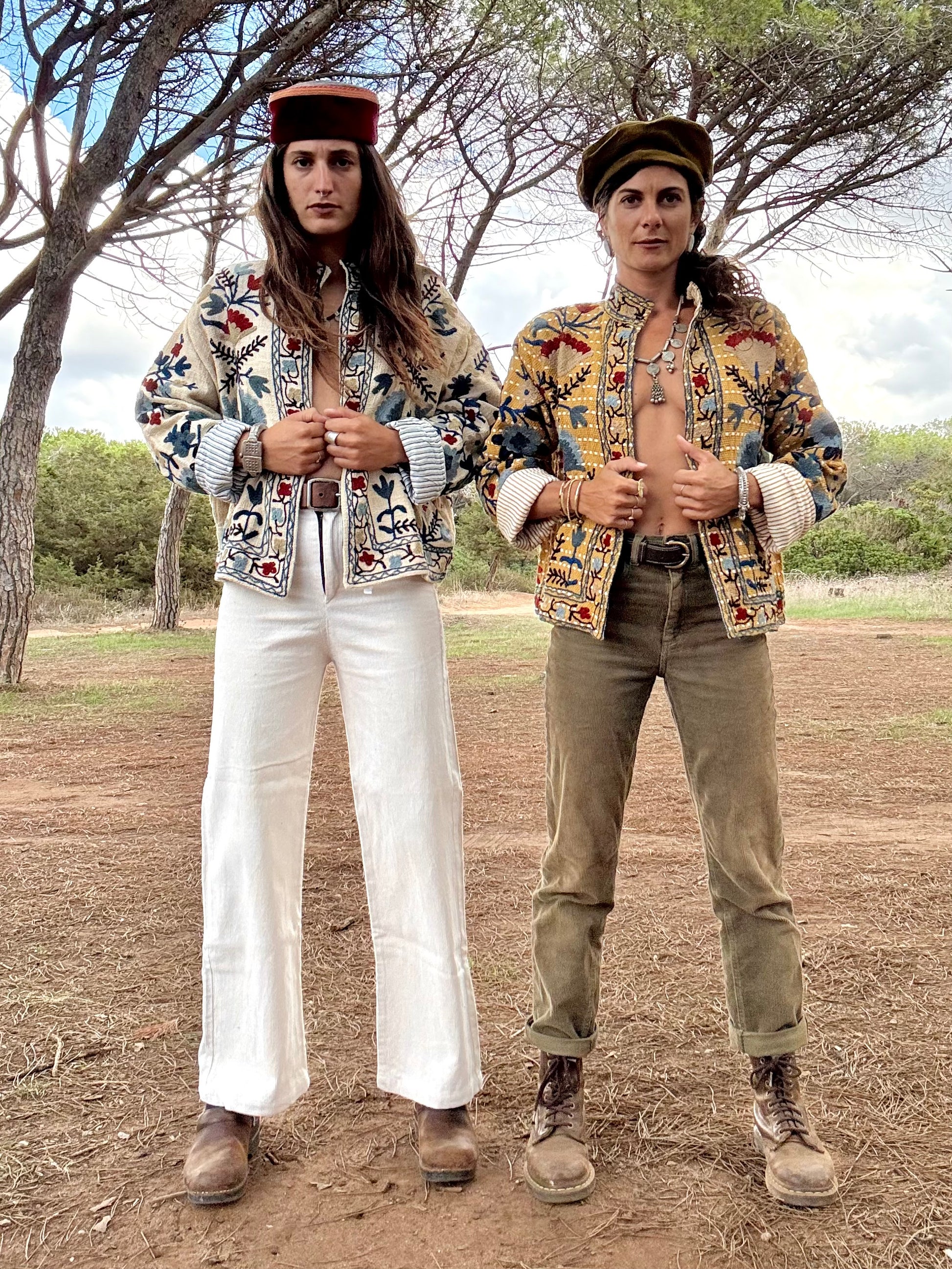 Il capo è stato disegnato per essere indossato in modo fluido e senza costrizioni. Il suo taglio oversize permette di giocarci, di risvoltarlo e di mostrare entrambi i lati del tessuto: da un lato, un velluto di cotone e dall’altro, una fodera in cotone stampata a mano con timbri di legno e pigmenti naturali.