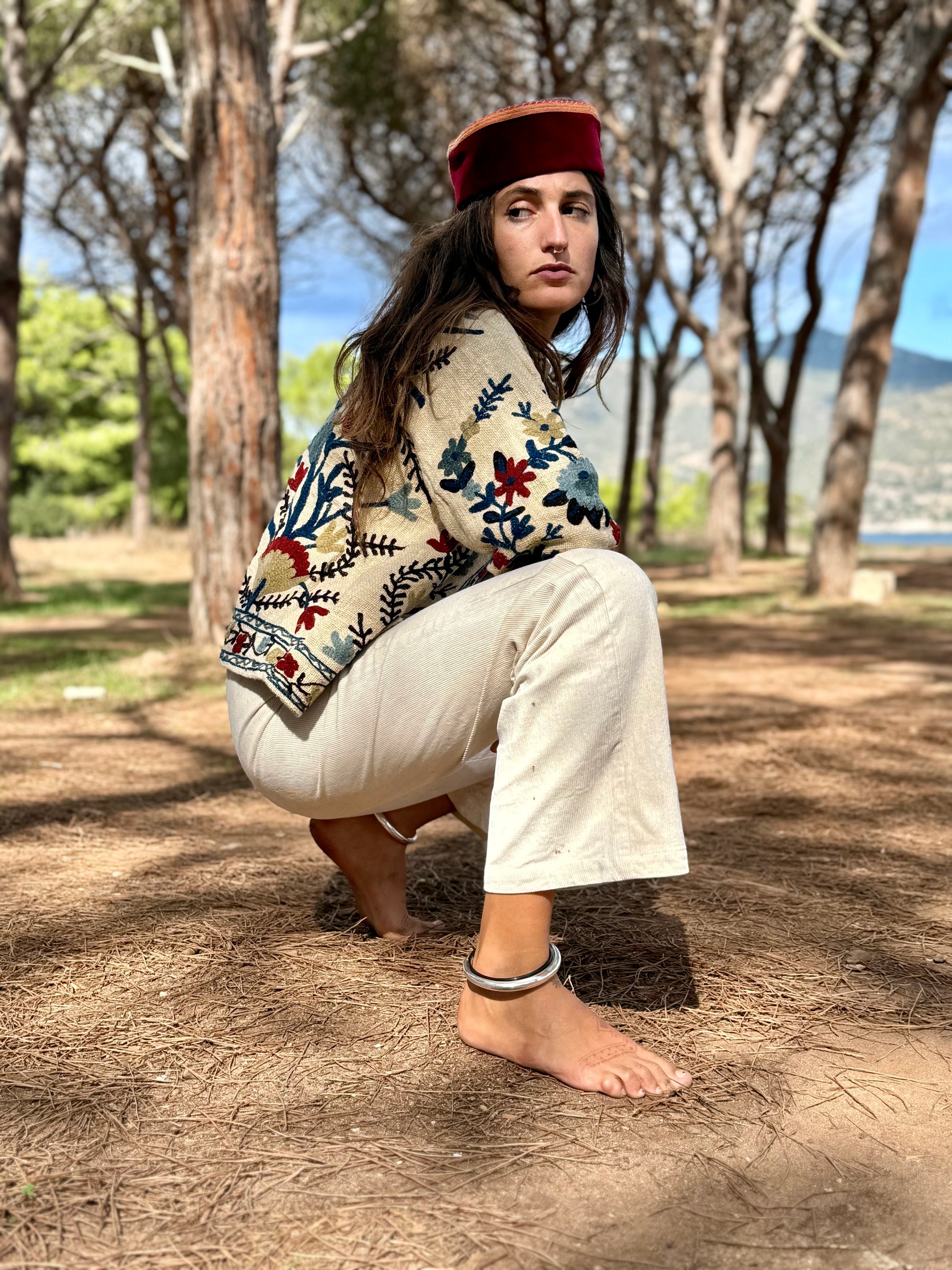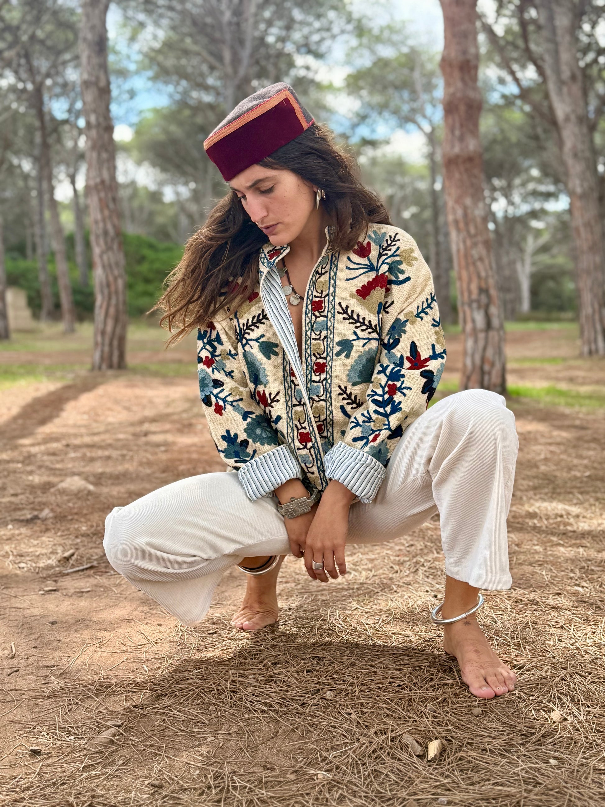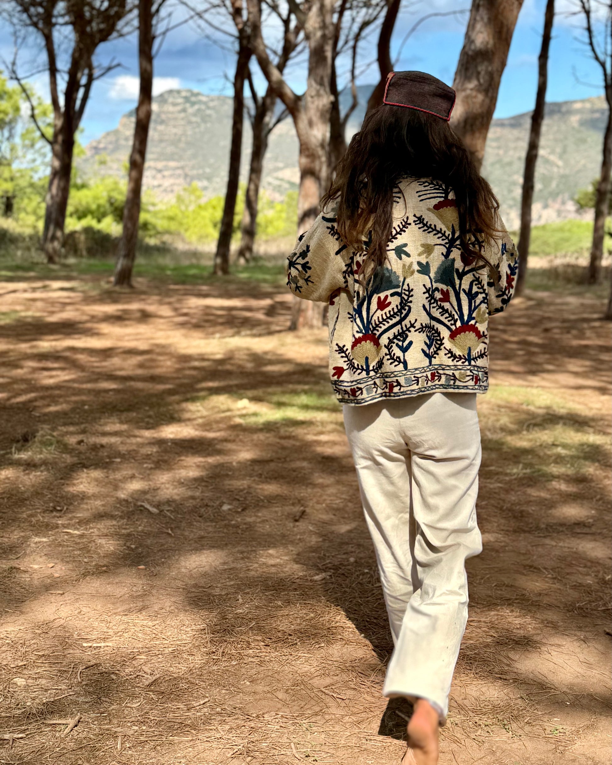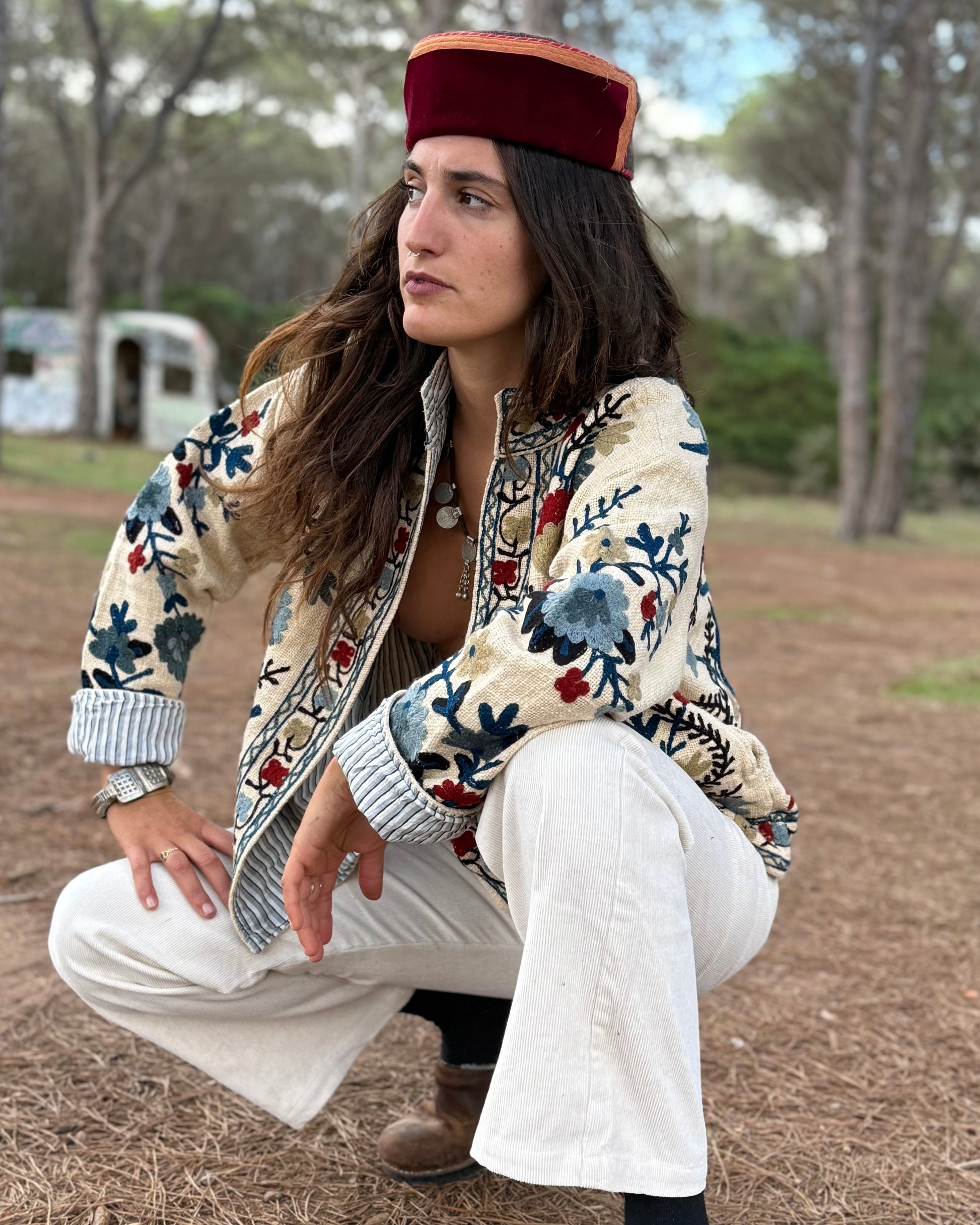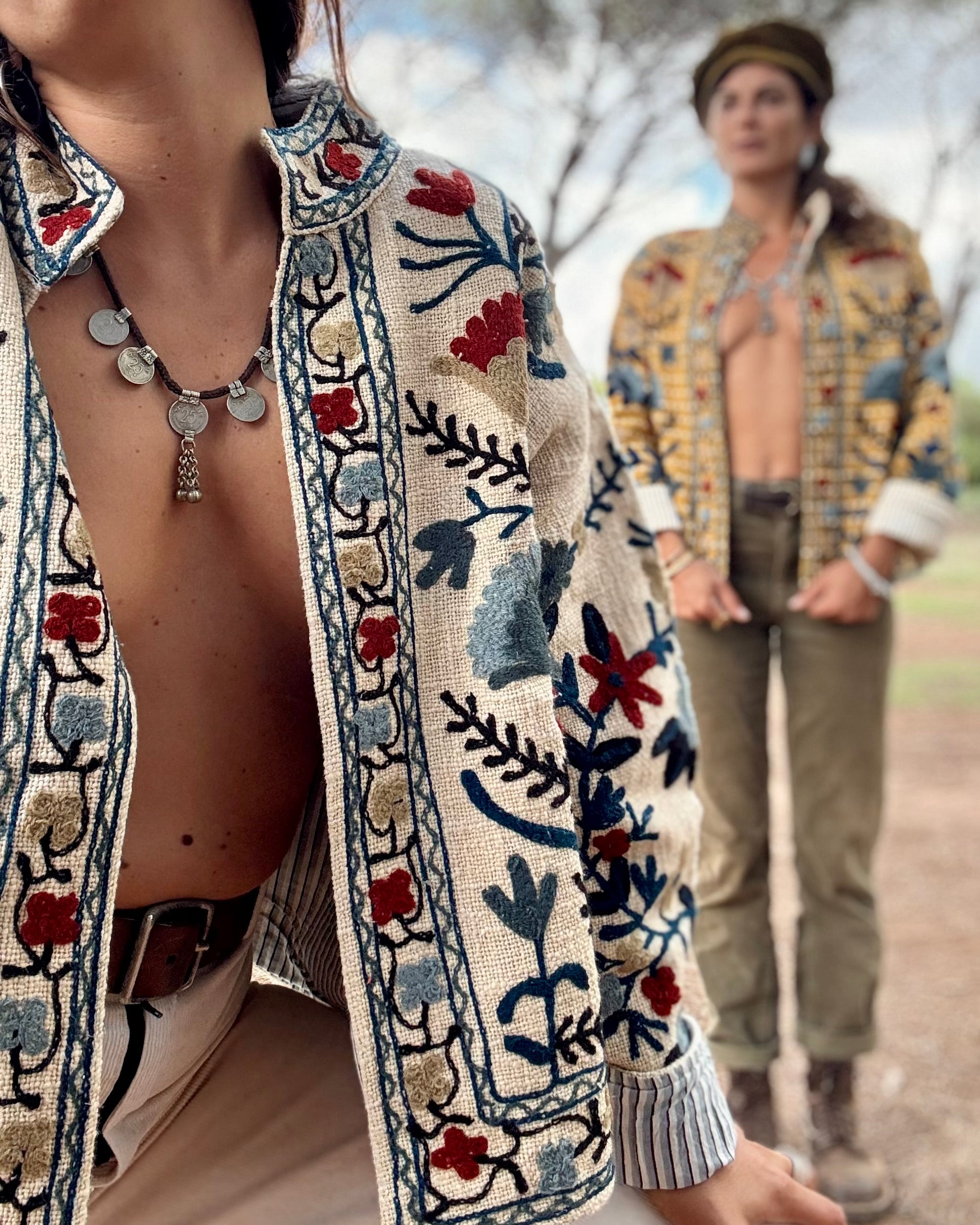 Il capo è stato disegnato per essere indossato in modo fluido e senza costrizioni. Il suo taglio oversize permette di giocarci, di risvoltarlo e di mostrare entrambi i lati del tessuto: da un lato, un velluto di cotone e dall’altro, una fodera in cotone stampata a mano con timbri di legno e pigmenti naturali.